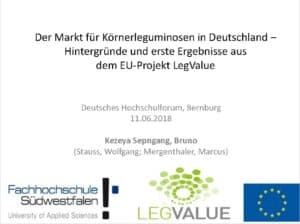 Hier stehen die Folien der Präsentation "Der Markt für Körnerleguminosen in Deutschland" zum Download bereit. Es handelt sich um Ergebnisse aus dem Projekt LEGVALUE.