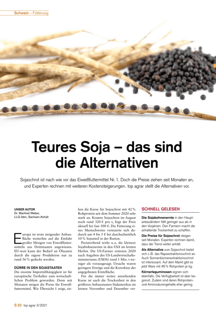 Sojaschrot ist nach wie vor das Eiweißfuttermittel Nr. 1. Doch die Preise ziehen seit Monaten an, und Experten rechnen mit weiteren Kostensteigerungen. top agrar stellt die Alternativen vor.