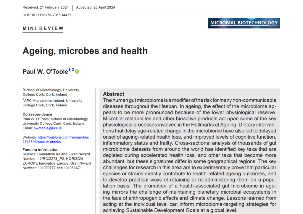 The human gut microbiome is a modifier of the risk for many non-communicable diseases throughout the lifespan. In ageing, the effect of the microbiome appears to be more pronounced because of the lower physiological reserve. Microbial metabolites and other bioactive products act upon some of the key physiological processes involved in the Hallmarks of Ageing. Dietary interventions that delay age-related change in the microbiome have also led to delayed onset of ageing-related health loss, and improved levels of cognitive function, inflammatory status and frailty. Cross-sectional analysis of thousands of gut microbiome datasets from around the world has identified key taxa that are depleted during accelerated health loss, and other taxa that become more abundant, but these signatures differ in some geographical regions. The key challenges for research in this area are to experimentally prove that particular species or strains directly contribute to health-related ageing outcomes, and to develop practical ways of retaining or re-administering them on a Population basis. The promotion of a health-associated gut microbiome in ageing mirrors the challenge of maintaining planetary microbial ecosystems in the face of anthropogenic effects and climate change. Lessons learned from acting at the individual level can inform microbiome-targeting strategies for achieving Sustainable Development Goals at a global level.