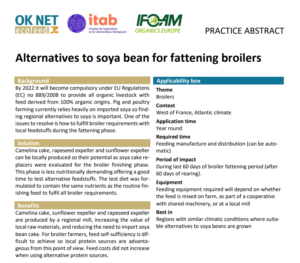 By 2022 it will become compulsory under EU Regulations (EC) no 889/2008 to provide all organic livestock with feed derived from 100% organic origins. Pig and poultryfarming currently relies heavily on imported soya so finding regional alternatives to soya is important. Camelina cake, rapeseed expeller and sunflower expeller can be locally produced so their potential as soya cake replacers were evaluated for the broiler finishing phase. This phase is less nutritionally demanding offering a good time to test alternative feedstuffs.