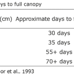 Research conducted in the northern steppe zone of Ukraine (Shepilova, 2009) showed that crops sown at 15 cm row widths reached full canopy closing when the plants had 3-5 nodes. Crops with 30 cm rows reached full canopy closure at budding to flowering (Growth Stage R1-R2). Crops with 70 cm rows did not close until flowering and pod formation (Growth Stage R2-R3). A similar effect is shown in Table 1.