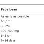 Table 2 shows the main sowing requirements of both crops. Deep sowing helps to ensure access to water for the germinating seed, which reduces the effects of early-season drought, and reduces the risk of predation by crows and pigeons. The water requirement is high due to the relatively large seed size. The target populations are lower for faba bean than for pea. Faba bean cultivars adapted to the Nordic region tend to have small seeds, 300–400 g/thousand, but in climates with longer growing seasons, the most productive beans are in the 500–800 g/thousand range and broad beans for food use can be up to 3000 g/thousand. Peas are generally somewhat smaller than the smaller sizes of faba beans.