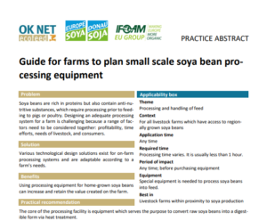 Soya beans are rich in proteins but also contain anti-nutritive substances, which require processing prior to feeding to pigs or poultry. Designing an adequate processing system for a farm is challenging because a range of factors need to be considered together: profitability, time efforts, needs of livestock, and consumers. Various technological design solutions exist for on-farm processing systems and are adaptable according to a farm's needs.