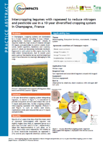 In Champagne, cropping systems are dominated by a 4-year rotation including 5 crops (wheat - spring barley - beetroot – rapeseed – wheat). It requires relatively high levels of mineral nitrogen (N) inputs and pesticides to control weeds (knotweed, lamb's quarters, bedstraw and vulpine), some of which are becoming herbicide-resistant. Rapeseed is well-suited to this region due to the mild winter temperatures, but in recent years pests such as flea beetle larvae and terminal bud weevil have become increasingly damaging to this crop. A 10-year diversified cropping system integrating legumes is considered to provide ecosystem services and reduce the use of N inputs and pesticides. In this cropping system, intercropping rapeseed with legumes such as lentils and beans, maintained yields and reduced the use of N inputs and pesticides.