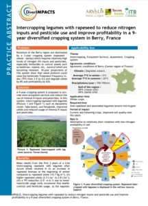 Rotations in the Berry region are dominated by a 3-year cropping system (rapeseed – wheat - barley) which requires relatively high levels of nitrogen (N) inputs and pesticides, especially herbicides to control weeds such as bedstraw, vulpine, etc., some of which are becoming resistant. 10-year projections of this system show that weed pressure could raise the herbicides Treatment Frequency Index (TFI) from 2.9 to 4.0 and degrade yields by 8% and profitability by 63%. A 9-year cropping system is proposed to provide more ecosystem services and reduce the use of mineral N inputs and pesticides. In this system, intercropping rapeseed with legumes such as Alexandria clover, faba beans, and fenugreek, improved yields and reduced usage of mineral N inputs and pesticides.