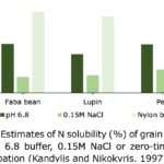 • PN56_Figure-2.png: Figure 2. Estimates of N solubility (%) of grain legumes using pH 6.8 buffer, 0.15M NaCl or zero-time nylonbag incubation (Kandylis and Nikokyris, 1997).