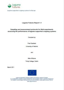 This report sets out the protocols for field measurements which were used throughout the Legume Futures research project. In some cases, more than one method is described. This is because the best method to use may be defined by the site characteristics, and also by the availability of staff, instrumentation and financial resources. This guide does not seek to define a common methodology for all variables. It provides guidance and support for those who may be new to some of these measurements. It has taken guidance from protocols followed in other European projects such as NitroEurope. This guide is used in Legume Futures to support partners in developing standard operating procedures for all measurements carried out on sites. It was written as an internal project document and is published here as part of the project’s efforts to provide full access to methods and to support other researchers in this area.