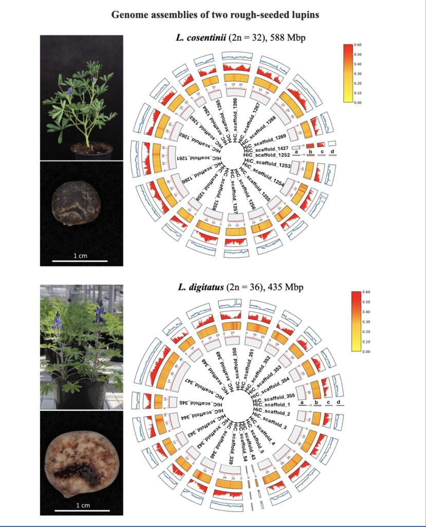 Lupin crops provide nutritious seeds as an excellent source of dietary protein. However, extensive genomic resources are needed for crop improvement, focusing on key traits such as nutritional value and climate resiliency, to ensure global food security based on sustainable and healthy diets for all. Such resources can be derived either from related lupin species or crop wild relatives, which represent a large and untapped source of genetic variation for crop improvement. Here, we report genome assemblies of the cross compatible species Lupinus cosentinii Mediterranean) and its pan-Saharan wild relative L. digitatus, which are well adapted to drought-prone environments and partially domesticated. We show that both species are tetraploids, and their repetitive DNA content differs considerably from that of the main lupin crops L. angustifolius and L. albus. We present the complex evolutionary process within the rough-seeded lupins as a species-based model involving polyploidization and rediploidization. Our data also provide the foundation for a systematic analysis of genomic diversity among lupin species to promote their exploitation for crop improvement and sustainable agriculture