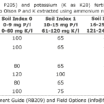 As the bacteria in the root nodules fix atmospheric nitrogen, little fertiliser nitrogen should be applied (only up to 30 kg/ha during establishment). Keeping soil mineral nitrogen low encourages nodule production and activity. Lucerne has a high demand for phosphorous (P) and potassium (K) fertiliser and the required application will depend on the soil index (as shown in table 1).